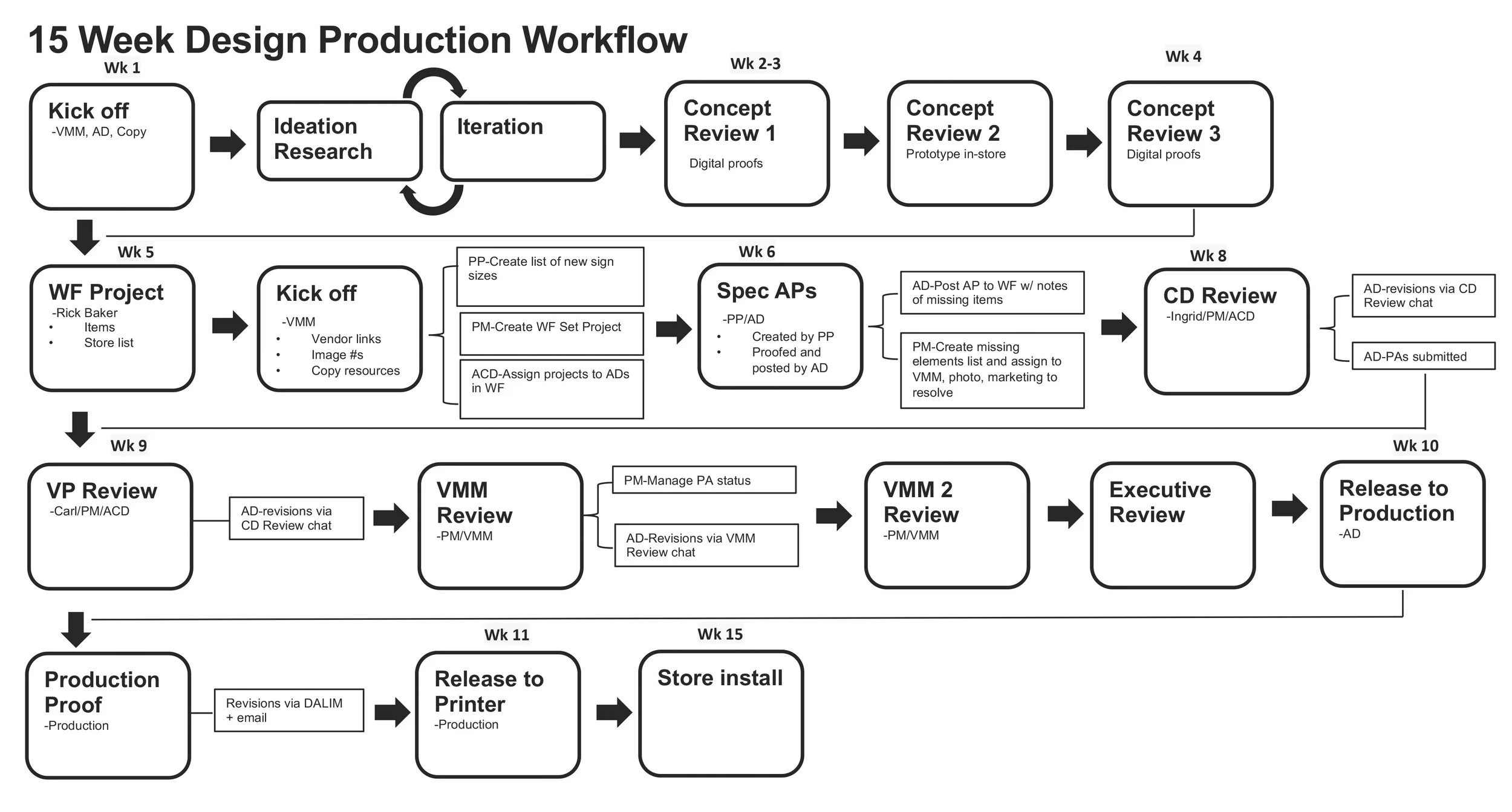 Coming out of bankruptcy with new owners, JCP’s store visuals department had been stripped of organization, guidelines, and department leadership. It was running on auto-pilot with one designer outputting the majority of work on an item-by-item basis. I was challenged with elevating store graphic design, but first I needed to establish a sustainable department design and production program.